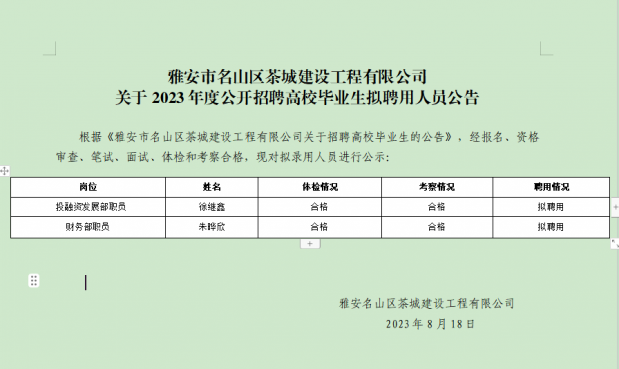 雅安市名山區(qū)茶城建設(shè)工程有限公司關(guān)于2023年度公開招聘高校畢業(yè)生擬聘用人員公告