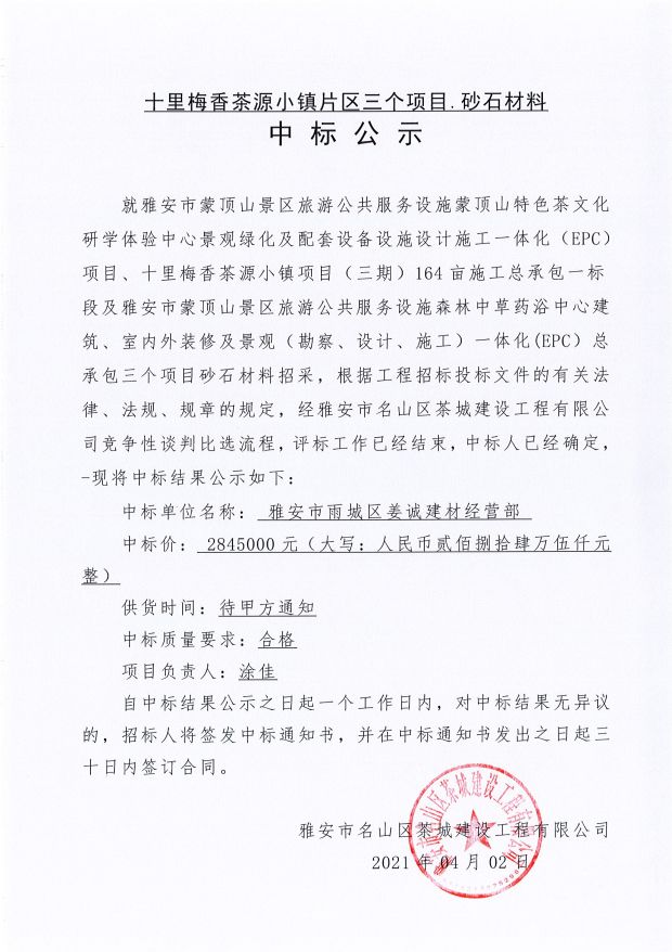 十里梅香茶源小鎮(zhèn)片區(qū)三個項(xiàng)目砂石材料中標(biāo)公示